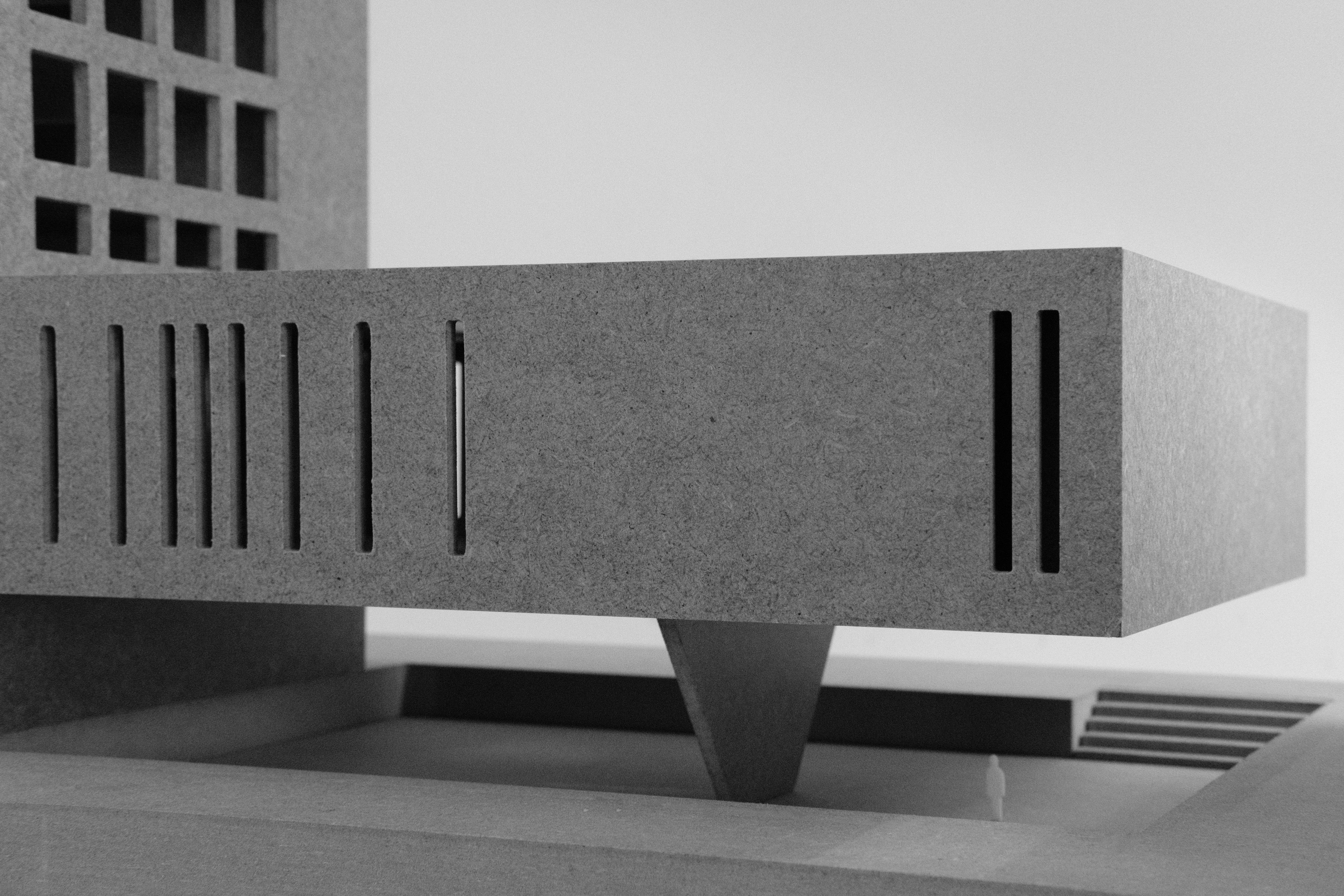 Der Entwurf transformiert die vormals geschlossene städtebauliche Situation der alten Zollanlagen in eine offene Raumabfolge, die das Gelände an die Stadt anbindet und als öffentlichen Freiraum artikuliert. Nach dem Konzept der Raumabfolge findet eine graduelle Abstufung der Öffentlichkeit über die Länge des Grundstücks hinweg statt. So kann eine starke, räumliche und programmatische Beziehung von Öffentlichkeit und Hochschule aufgebaut werden.