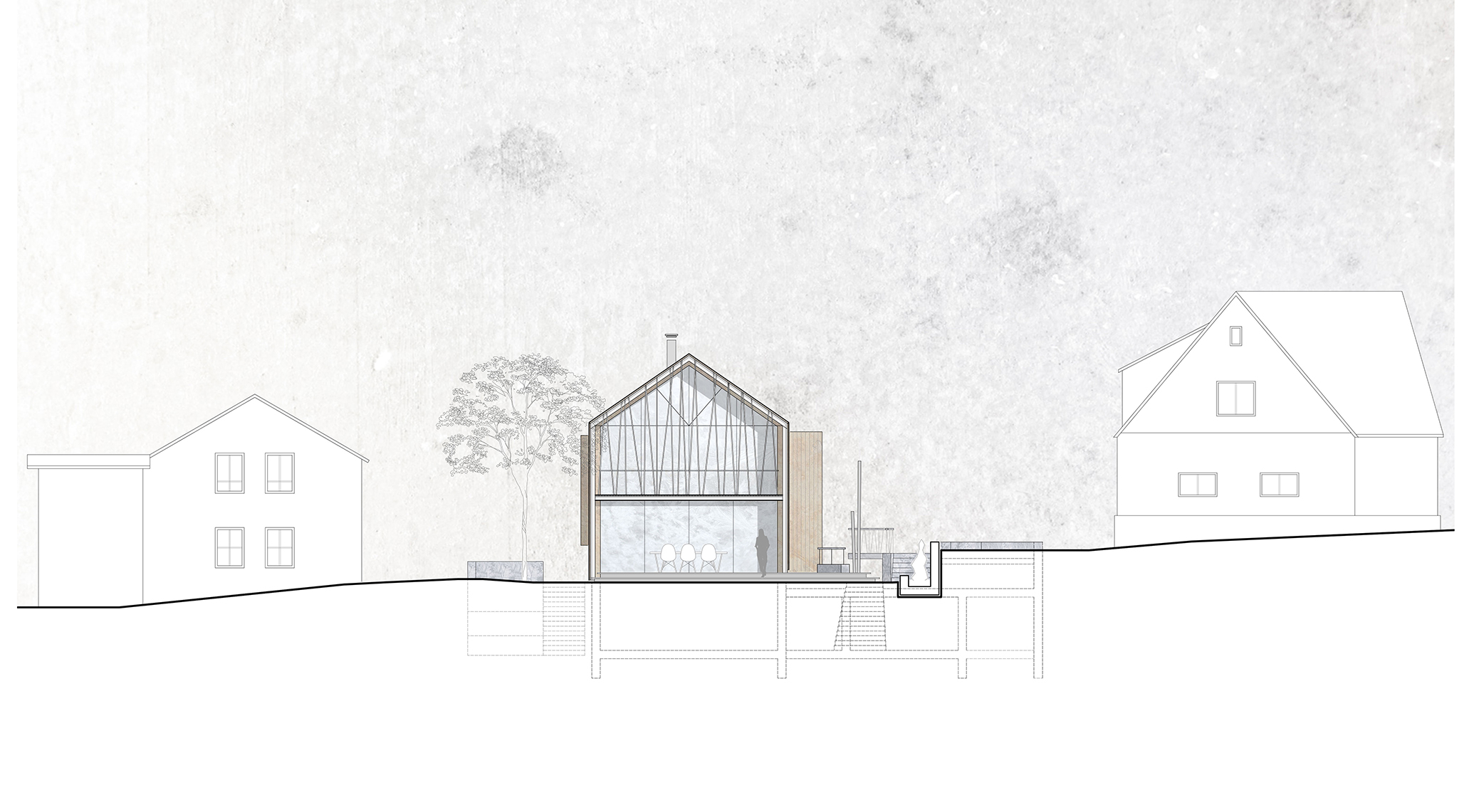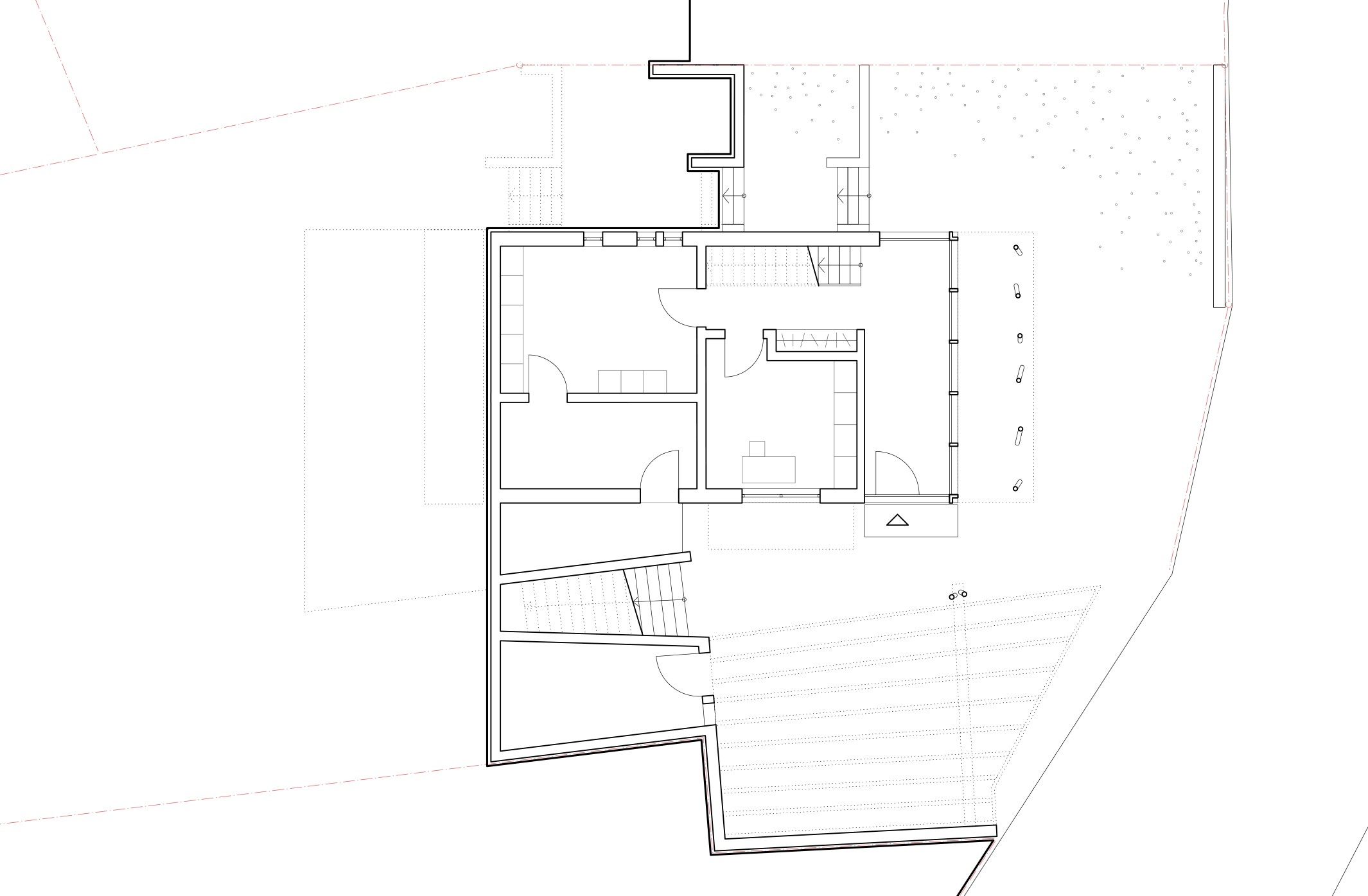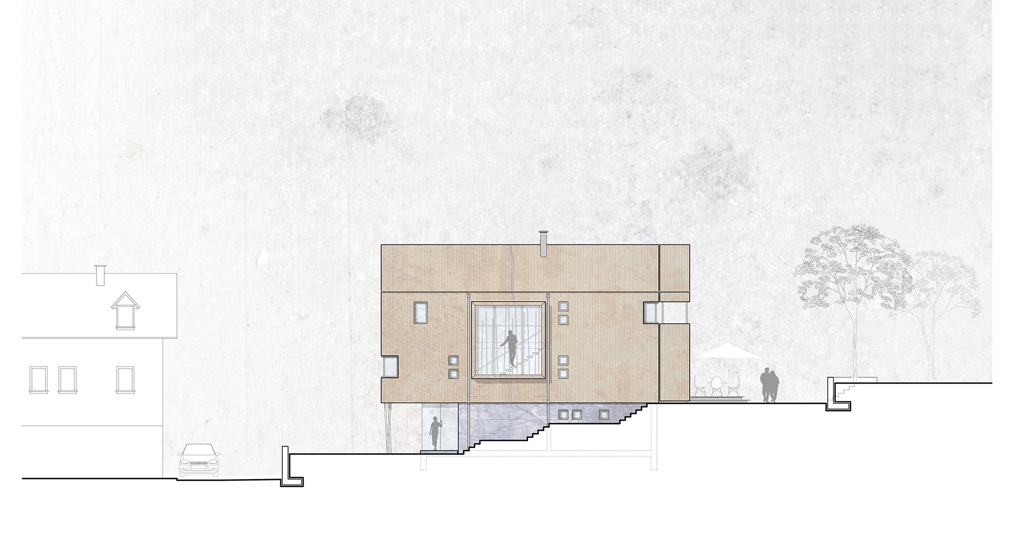 Der Entwurf nutzt diesen vorhandenen Geländeverlauf und das Geschoss auf Straßenniveau fügt sich in das natürlich steigende Gelände ein. Im belichteten Teil ensteht hier ein heller Bereich zum Ankommen, sowie ein Büro. Im unbelichteten Teil des Geschosses befinden sich Keller- und Abstellräume.