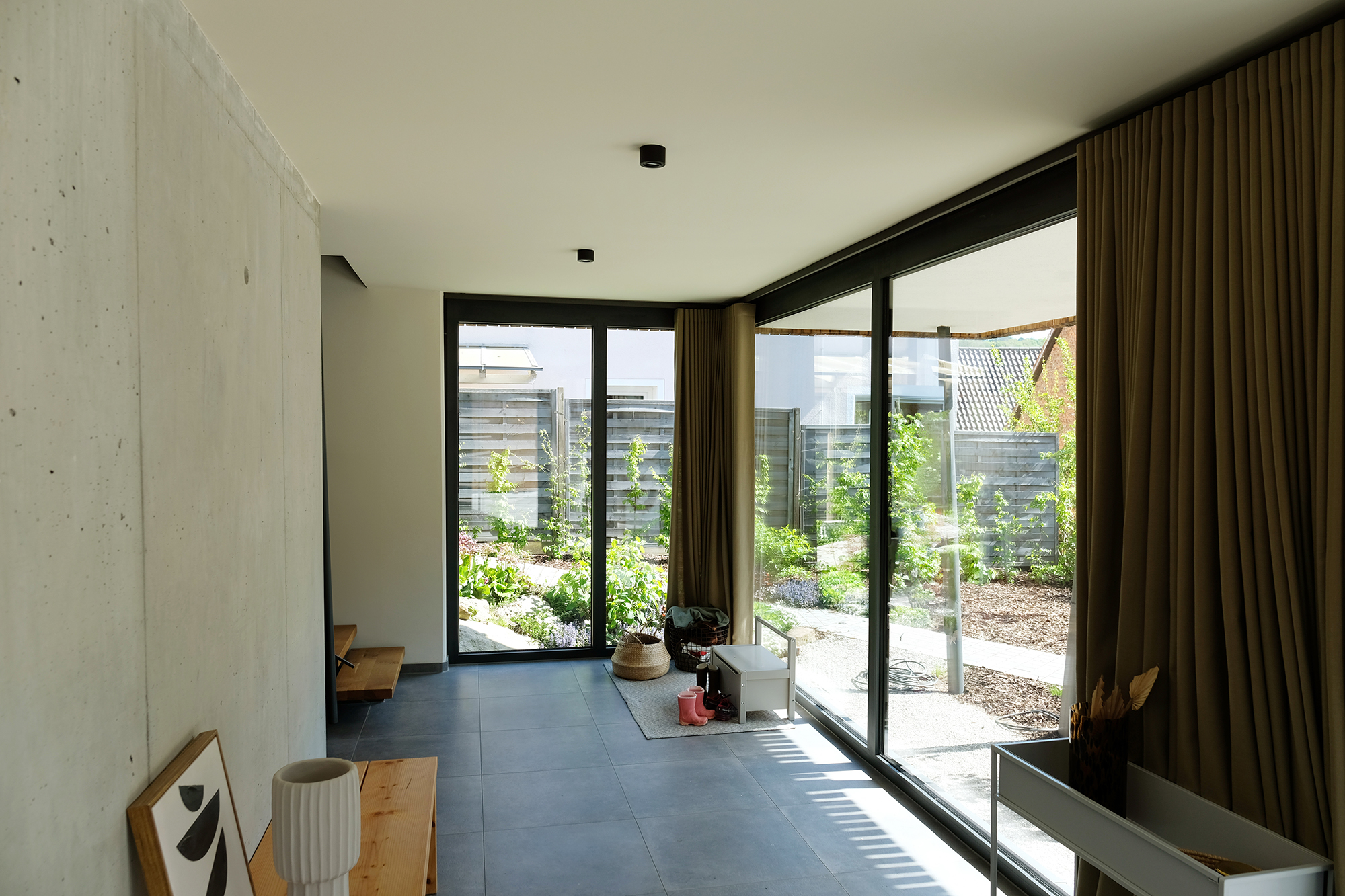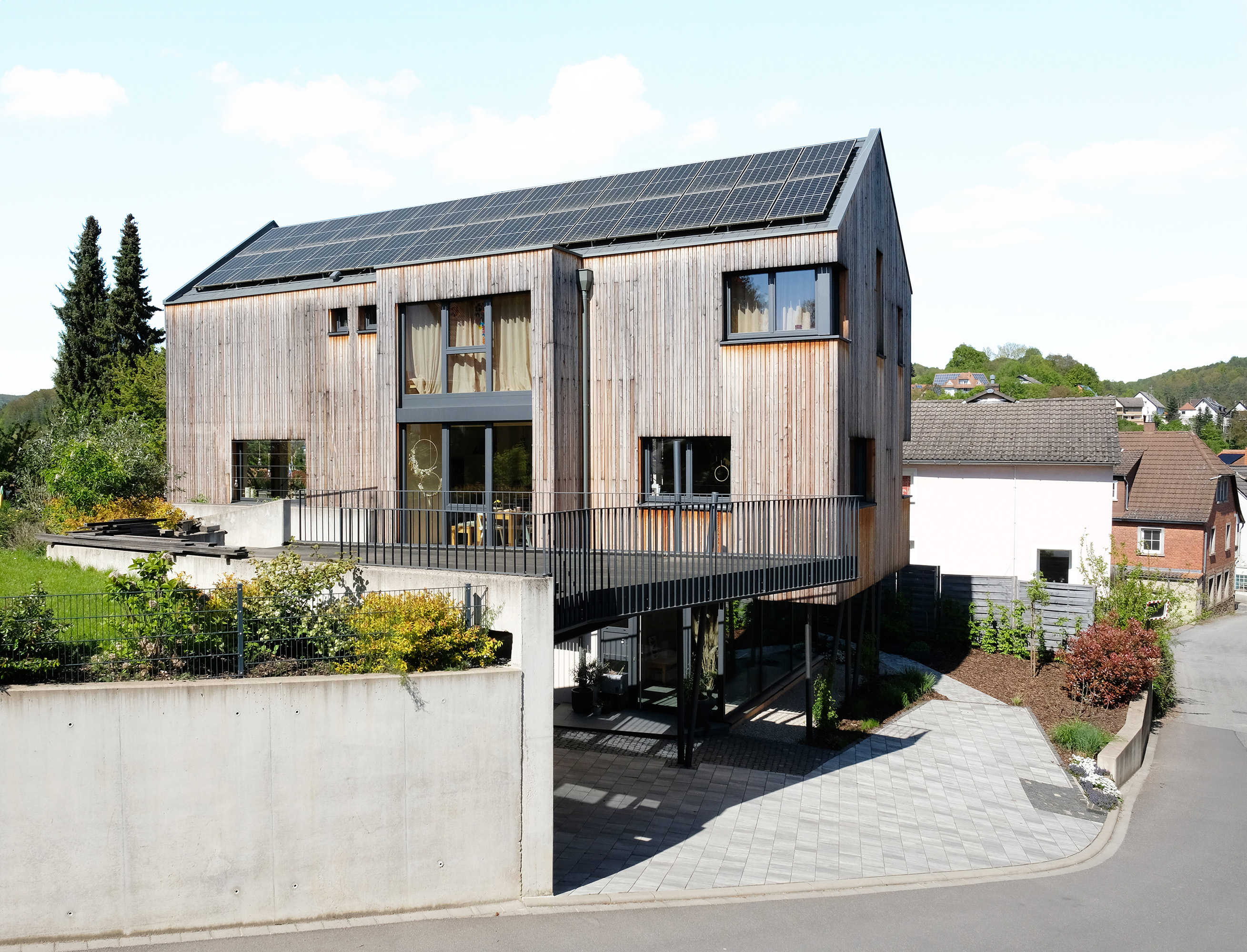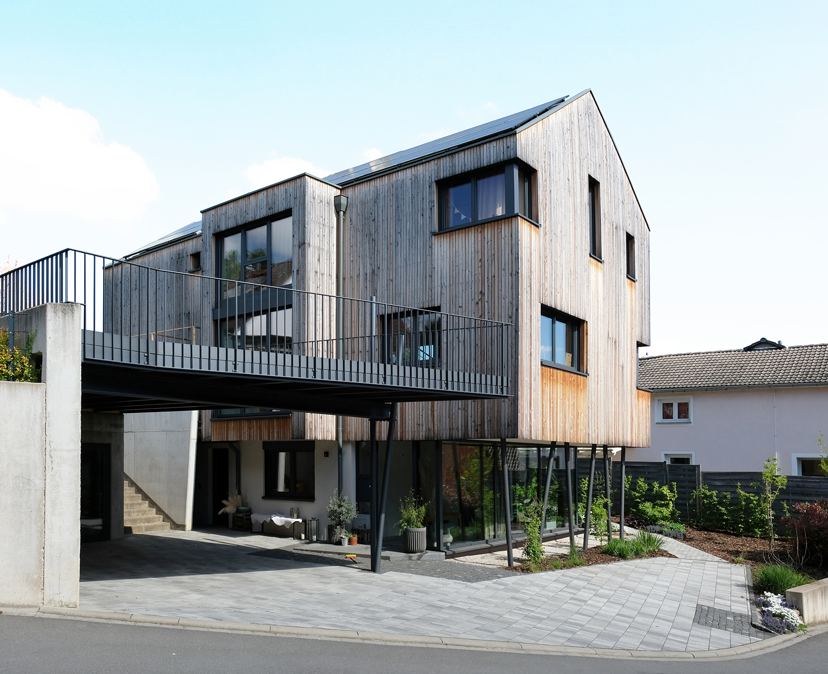 Nach Betreten des Hauses führt eine Treppe nach oben, wo sich das Wohngeschoss als offener Grundriss zum geschützten Gartenbereich hin orientiert. Im Dachgeschoss befinden sich die Schlafzimmer. Das Kellergeschoss aus Stahlbeton und Glas wirkt zur Straße hin fast völlig transparent, sodass die Obergeschosse, die als Holzmassivbaukonstruktion ausgeführt wurden, auf den schräg gestellten Aluminiumstützen zu schweben scheinen. Die Ansicht ist reduziert, Regenrinnen sind in die Dachfläche integriert und Akzente in der Fassade entstehen durch die zwei hervorspringenden Erkerfenster, die in Längsrichtung den Essbereich und den Treppenaufgang mit Licht füllen. Zum Garten im hinteren Grundstücksteil öffnet sich das Haus vollständig durch eine Glasfassade mit Schiebeelementen. Dem Haus vorgestellt ist ein Balkon, der in seiner Gestaltung als Teil des Hauses wahrgenommen wird und die großen Glasflächen vor Regen und Sonne schützt.