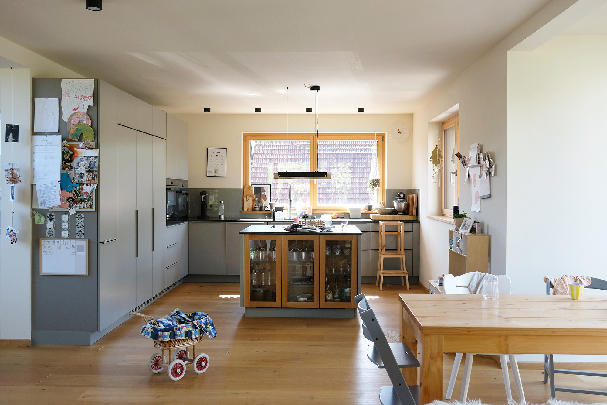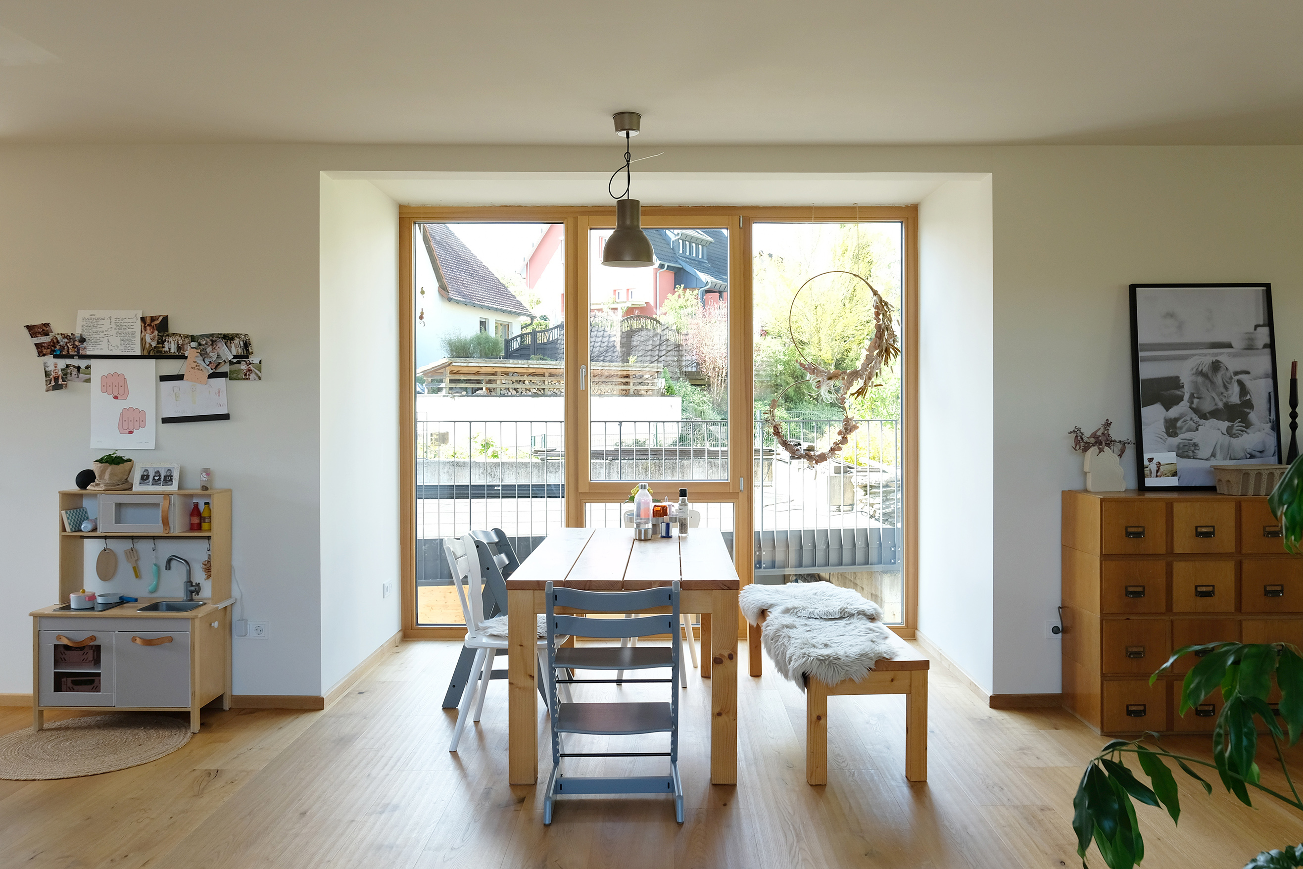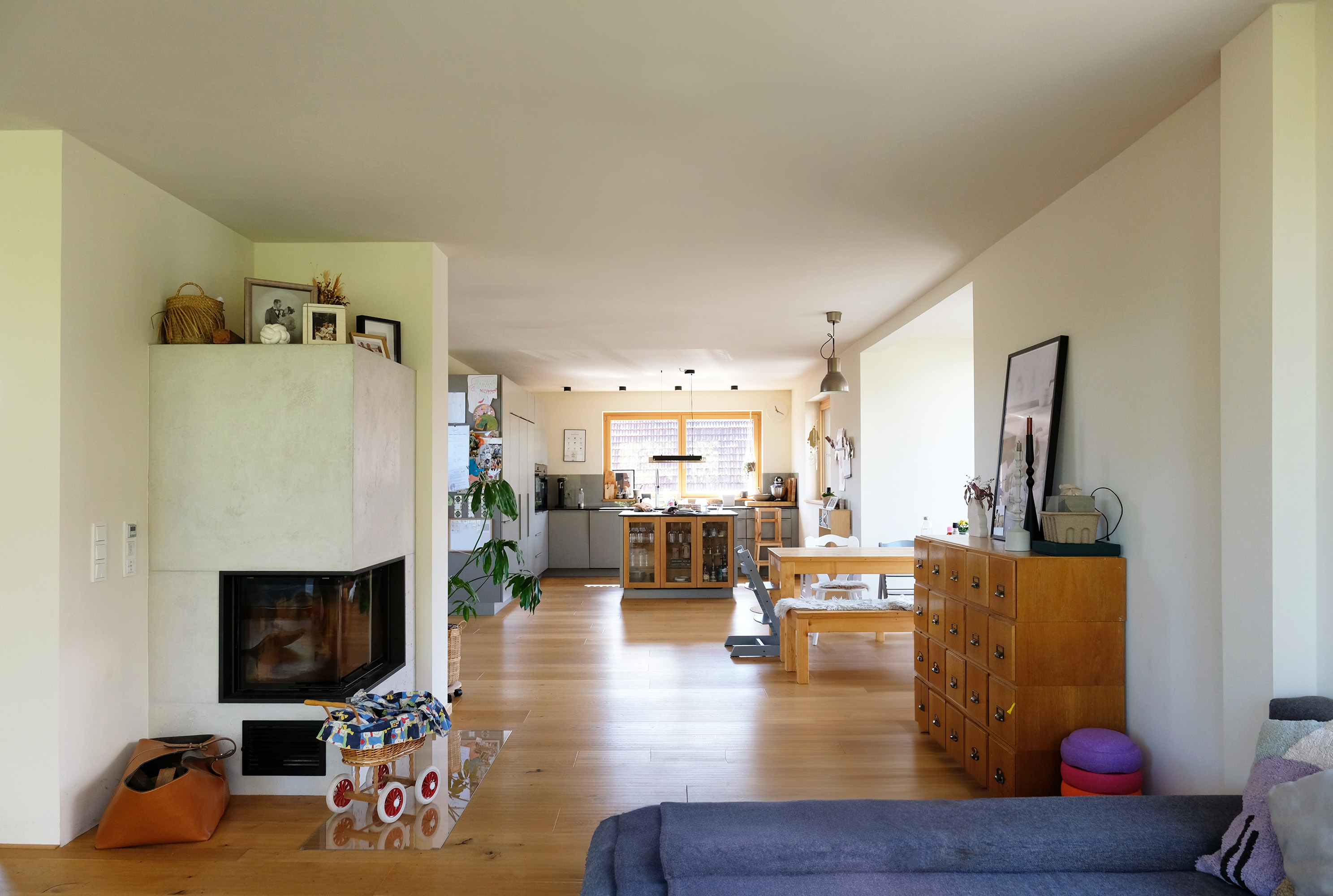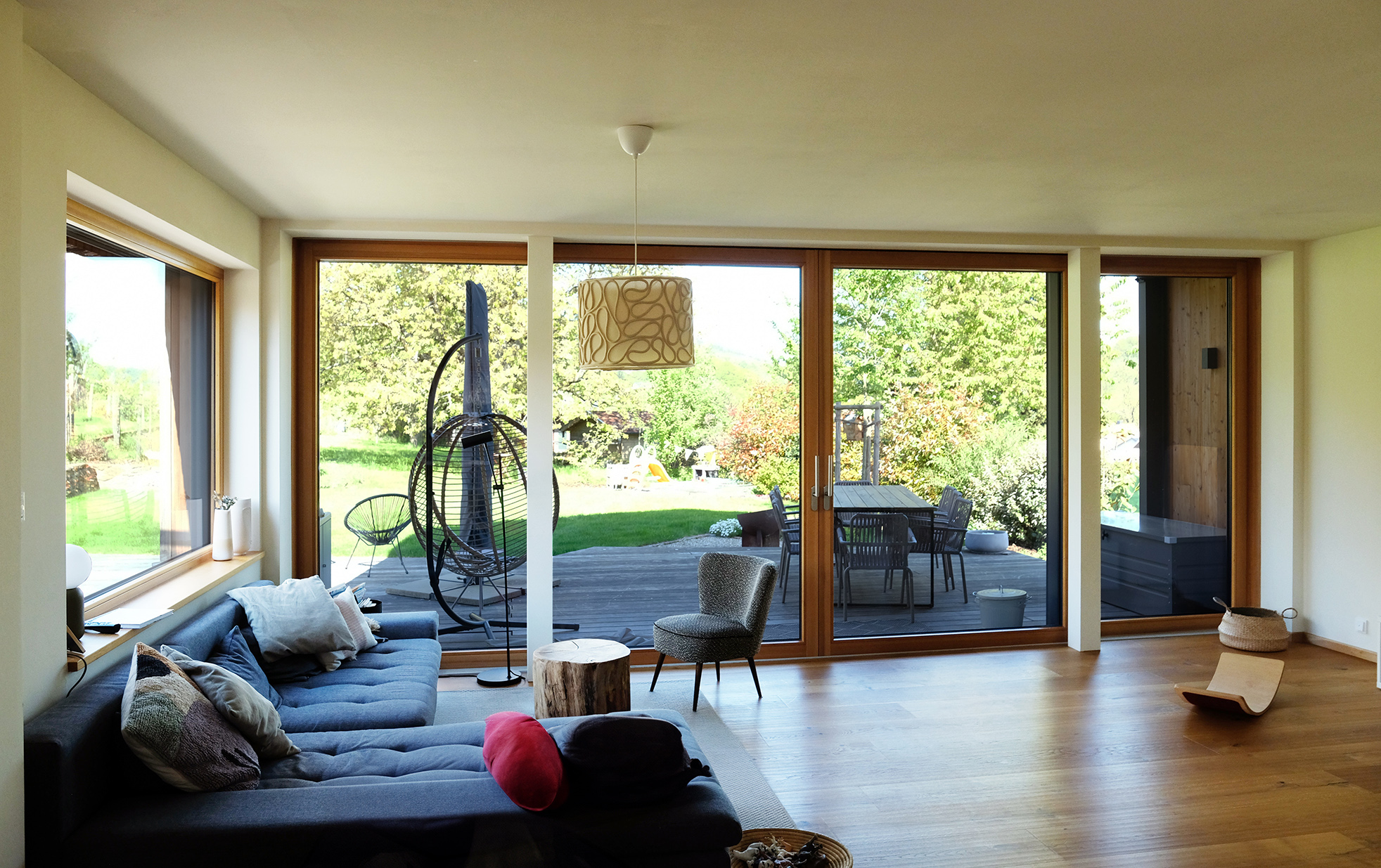 Nach Betreten des Hauses führt eine Treppe nach oben, wo sich das Wohngeschoss als offener Grundriss zum geschützten Gartenbereich hin orientiert. Im Dachgeschoss befinden sich die Schlafzimmer. Das Kellergeschoss aus Stahlbeton und Glas wirkt zur Straße hin fast völlig transparent, sodass die Obergeschosse, die als Holzmassivbaukonstruktion ausgeführt wurden, auf den schräg gestellten Aluminiumstützen zu schweben scheinen. Die Ansicht ist reduziert, Regenrinnen sind in die Dachfläche integriert und Akzente in der Fassade entstehen durch die zwei hervorspringenden Erkerfenster, die in Längsrichtung den Essbereich und den Treppenaufgang mit Licht füllen. Zum Garten im hinteren Grundstücksteil öffnet sich das Haus vollständig durch eine Glasfassade mit Schiebeelementen. Dem Haus vorgestellt ist ein Balkon, der in seiner Gestaltung als Teil des Hauses wahrgenommen wird und die großen Glasflächen vor Regen und Sonne schützt.