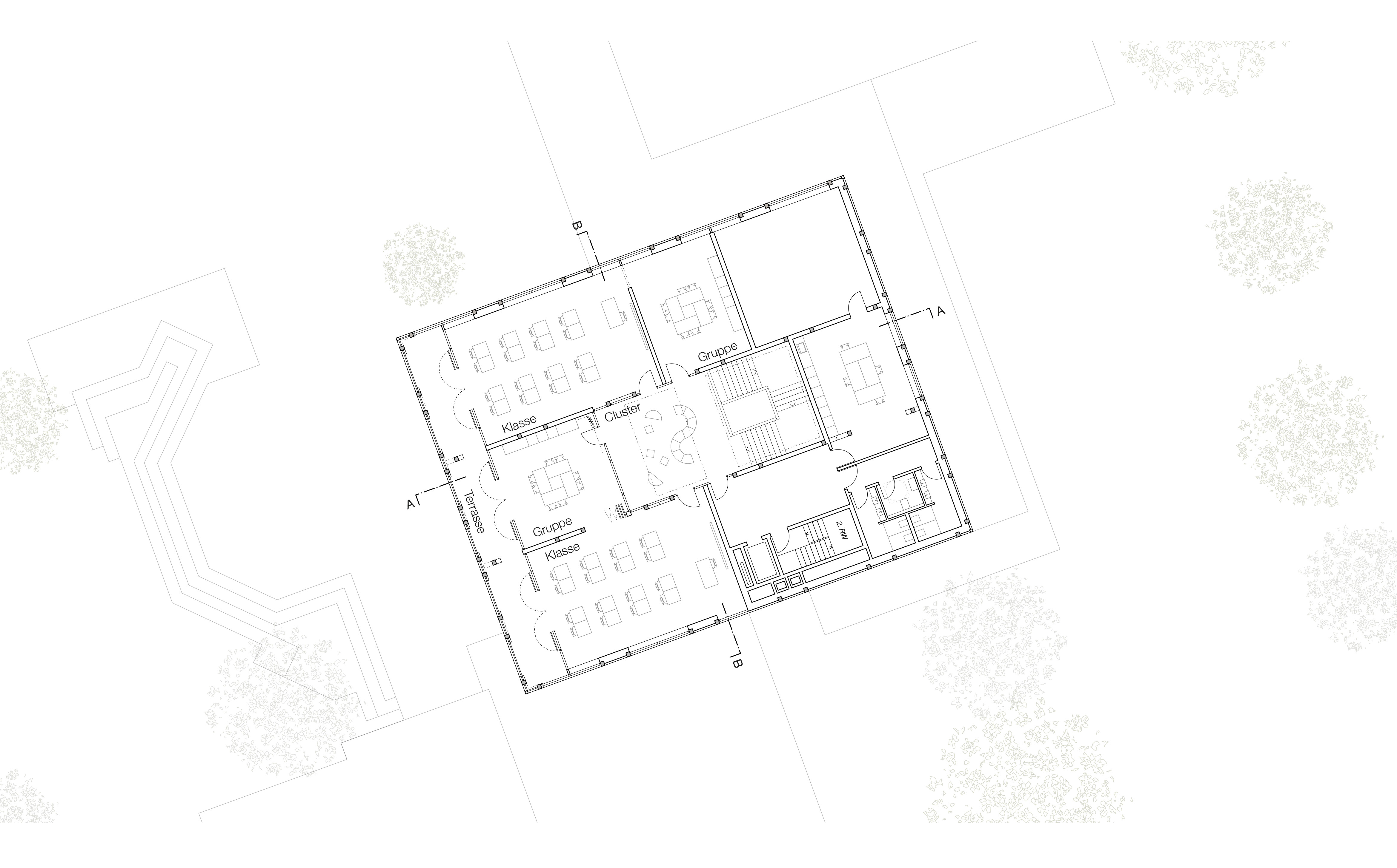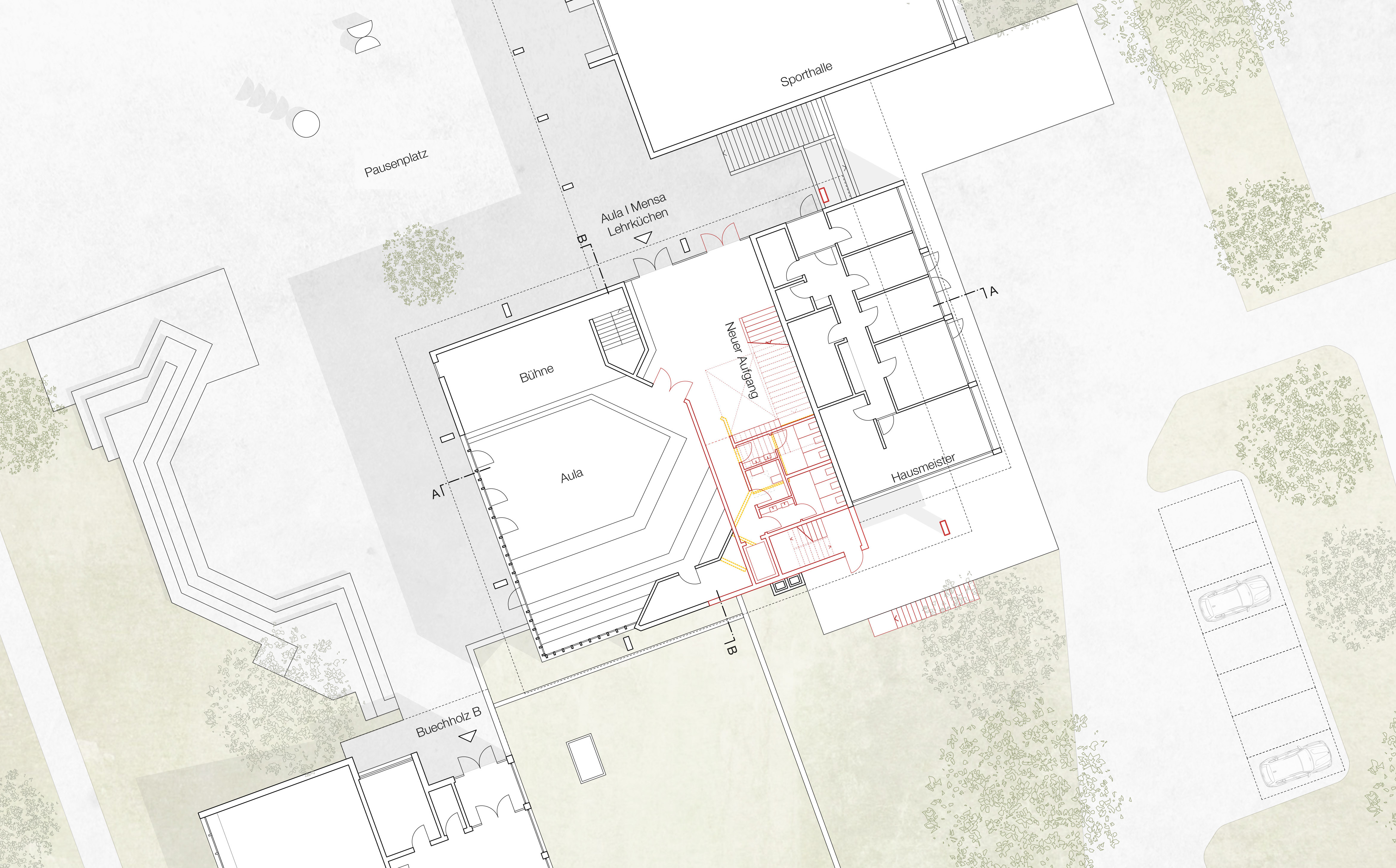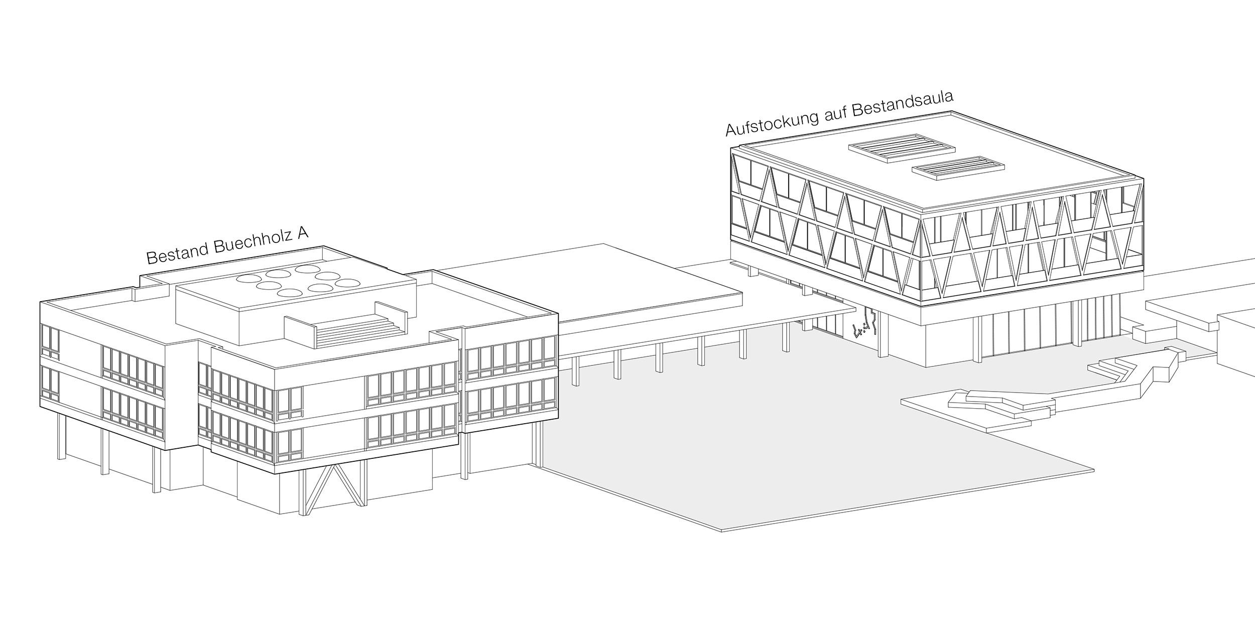 Die geplante Erweiterung des Schulhaus Buechholz wird zu einem neuen Zentrum und Begegnungsort innerhalb des Schulkomplexes. Ein ausdrucksstarker Baukörper oberhalb der bestehenden, eingeschossigen Aula ergänzt das bauliche Ensemble auf sinnvolle Weise. Dem Schulhaus A von Marti und Kast wird ein zweiter Hochpunkt gegenübergestellt, der dem Pausenplatz eine angemessene räumliche Einfassung gibt und sich harmonisch in die Topographie des Geländes und der bestehenden Lernlandschaft einfügt.