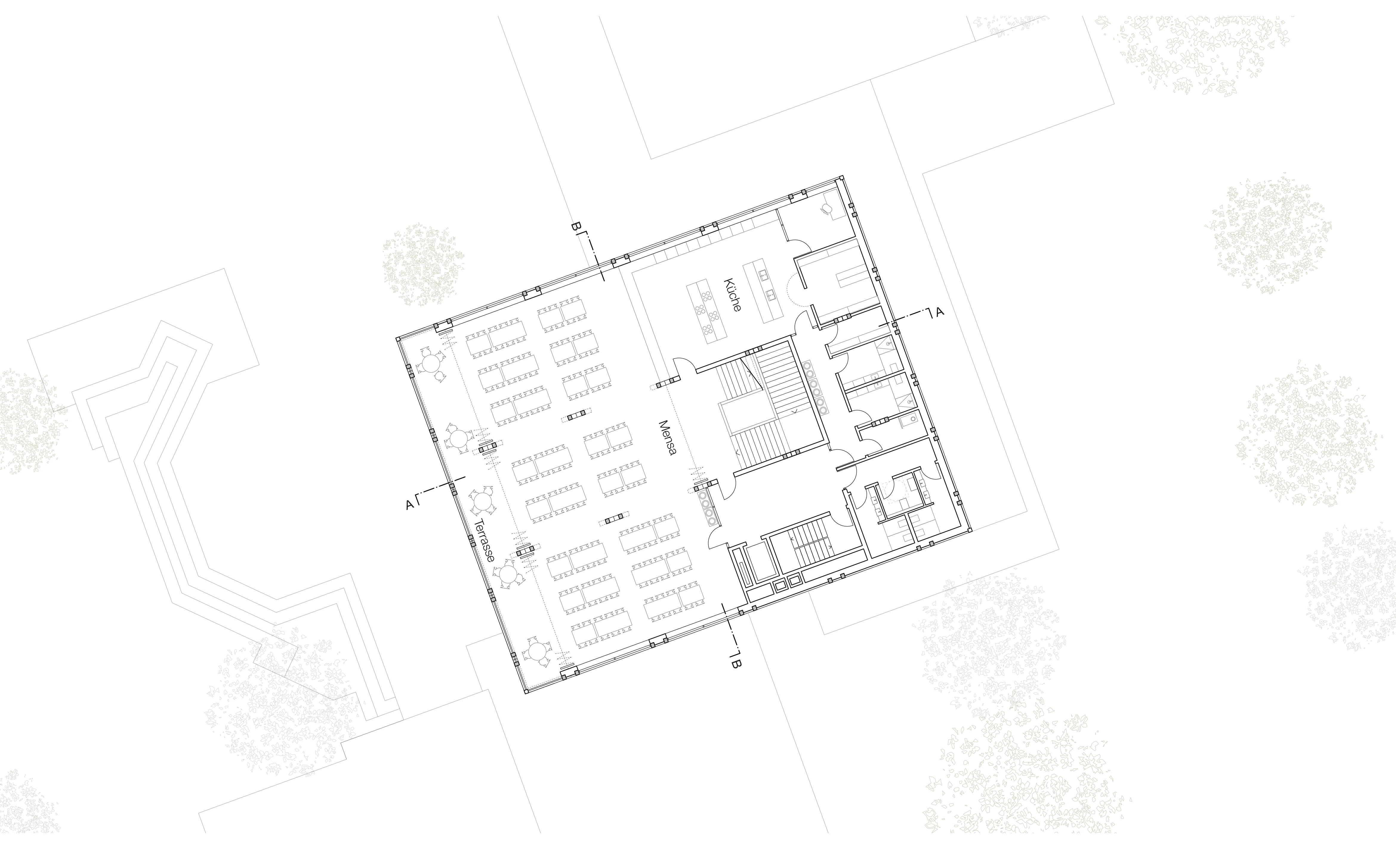 Eine neue helle Treppenanlage verbindet das Foyer der Bestands-Aula mit dem Anbau und führt die Schüler*innen direkt in den grosszügigen und gut belichteten Speisesaal mit Aussenterrasse und Blick über den Zürichsee. Im 2. Obergeschoss befindet sich ein flexibel nutzbares Lerncluster.
