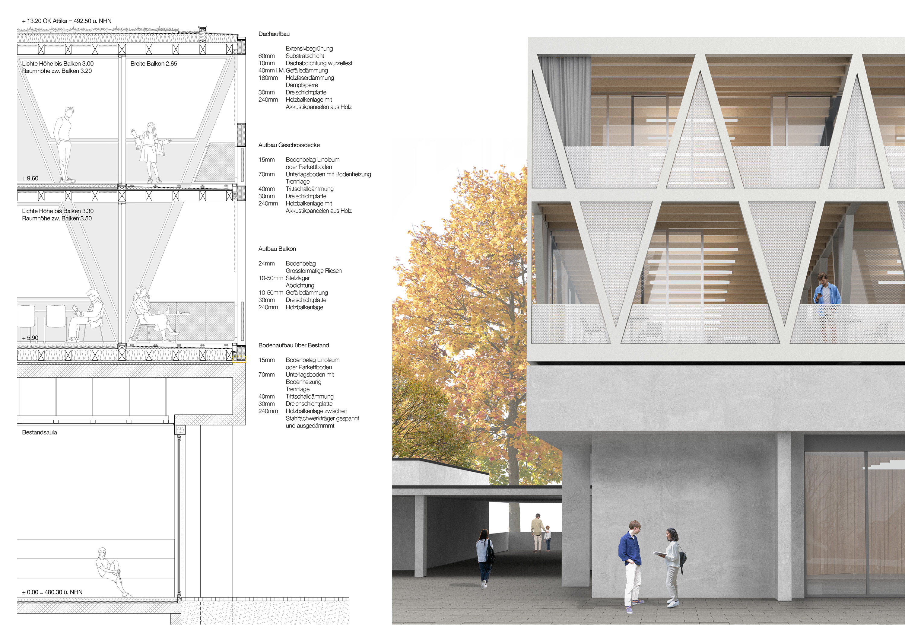 Die Aufstockung schwebt, abgesetzt durch eine leichte Schattenfuge, über dem markanten Stahlbetonband, welches die Fassade der Aula prägt. Das neue Primärtragwerk ist als Stahlfachwerk konzipiert und prägt sowohl die Innenräume als auch die Fassade des Entwurfs. Durch das gewählte Tragwerkskonzept findet eine Lastabtragung ausschliesslich ausserhalb der Gebäudehülle des Bestandsgebäudes über bestehende und neue Stützen statt. So wird eine konstruktive Unabhängigkeit vom Bestand angestrebt und komplizierte bautechnische Schnittpunkte vermieden.