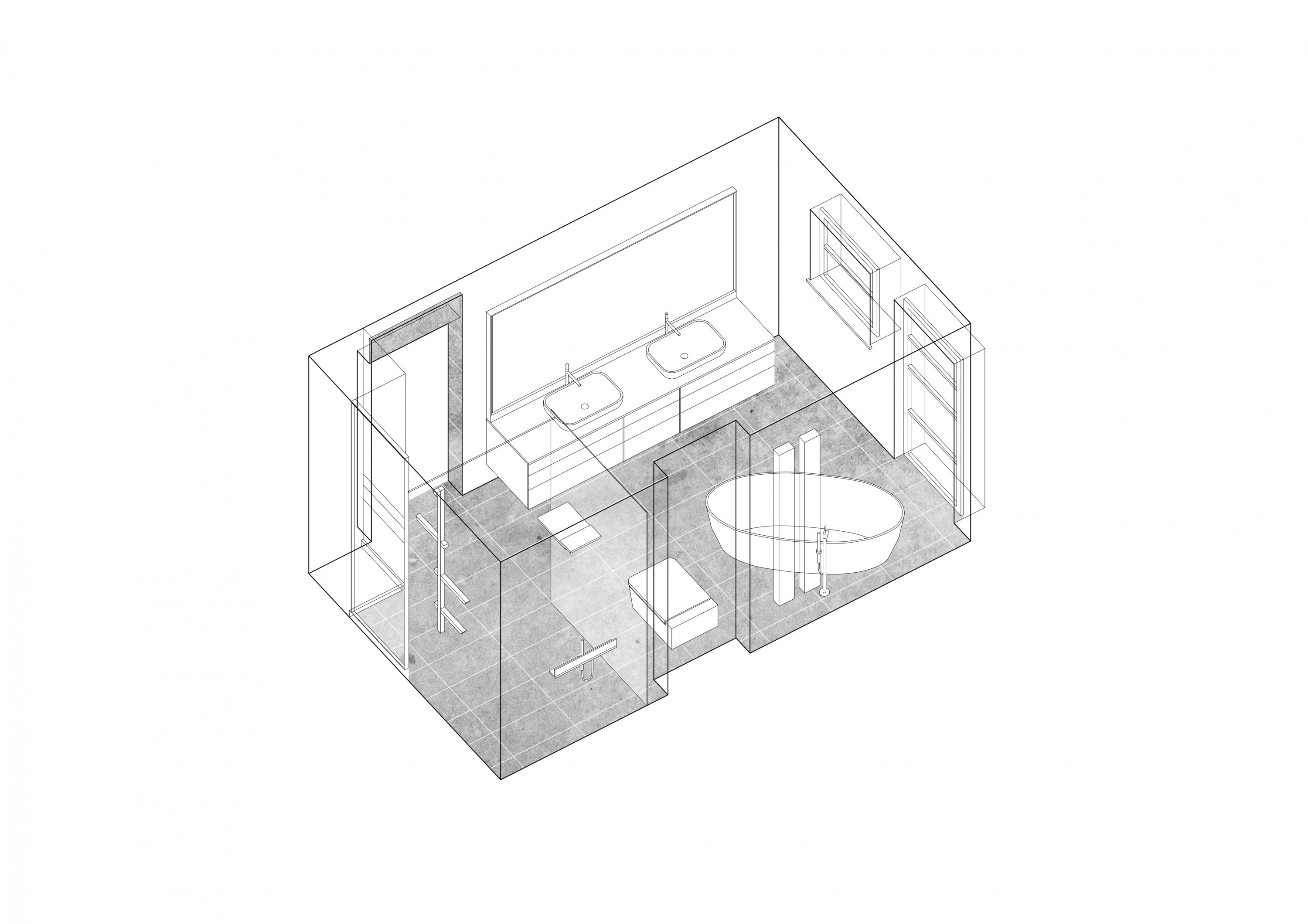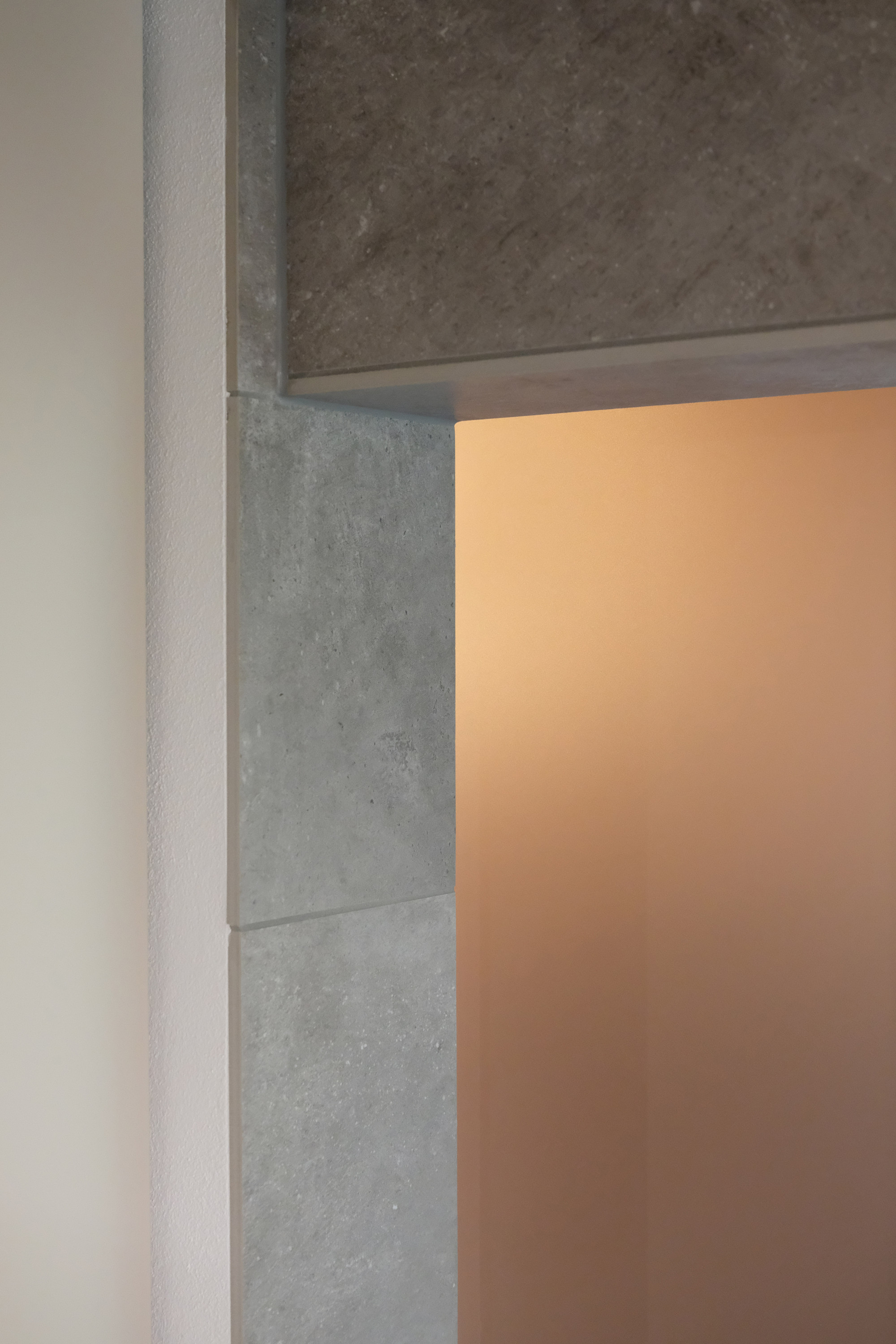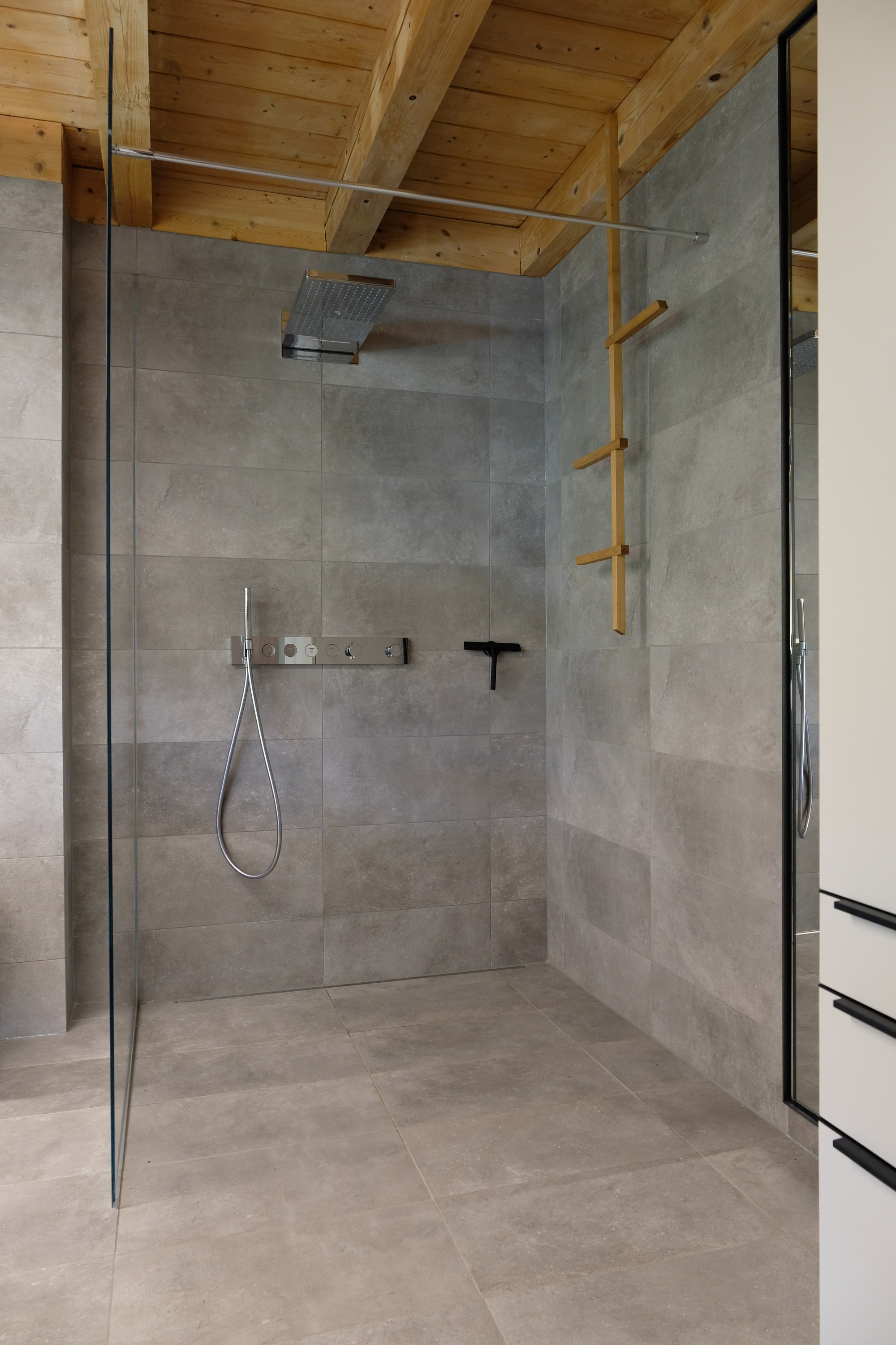 Hochwertige und langlebige Materialien und einfache, durchdachte Details erzeugen eine reduzierte und klare Formensprache. Die bestehende Holzbalkendecke verbindet sich mit den modernen Materialien des Umbaus und es ensteht eine helle, ansprechende und zeitgemäße Raumwirkung. Die Wände, der Boden und die Türlaibung wurden mit großformatigen, hellgrauen Fliesen mit einer dezenten, hochwertigen Oberflächenstruktur belegt.