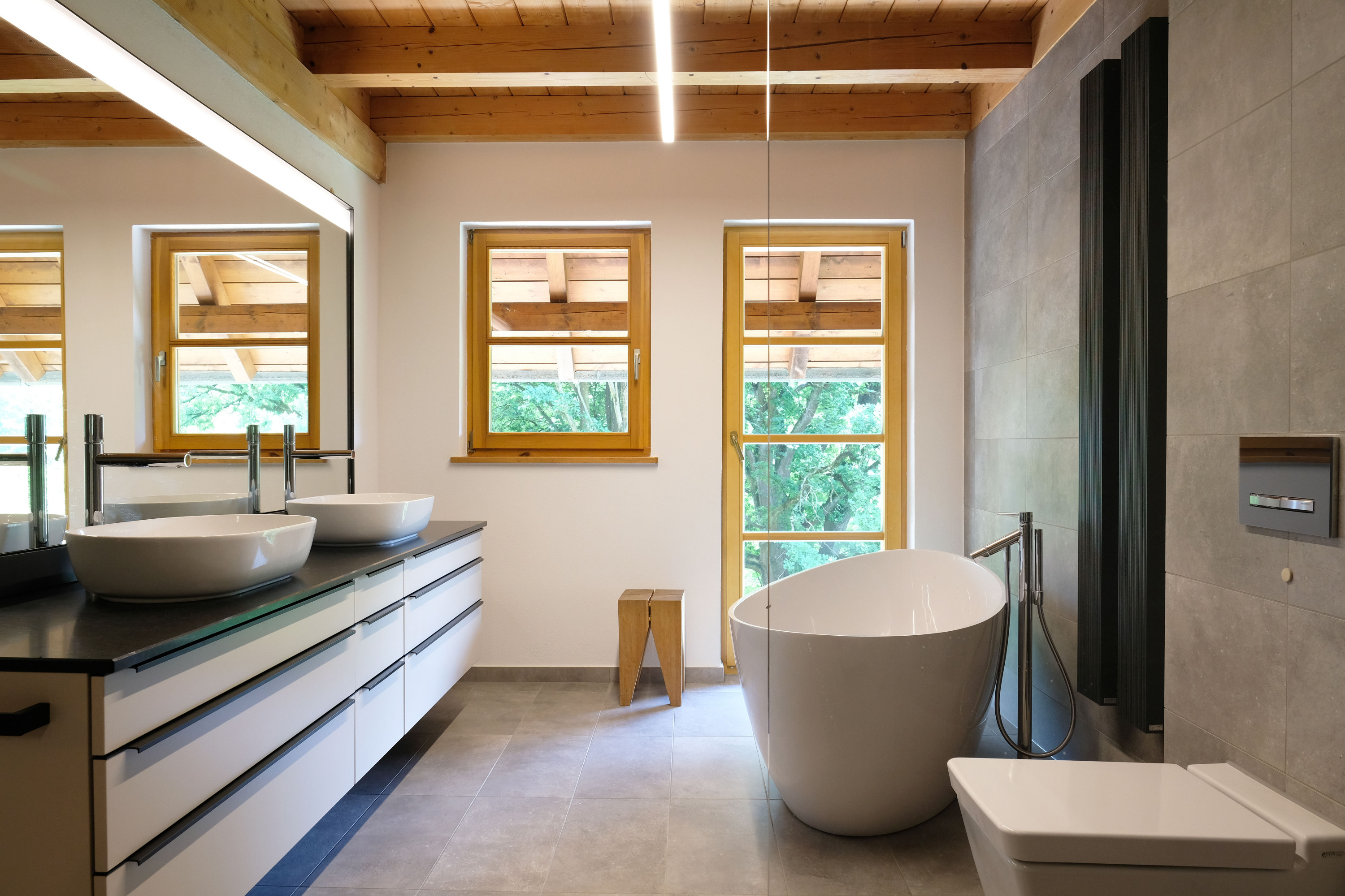 Eines der bestehenden Fensterelemente wurde durch ein bodentiefes Element ersetzt um aus der freistehenden Badewanne einen Blick in den Garten zu ermöglichen. Die Dusche ist als offener Bereich nur über eine Glastrennwand eingefasst.