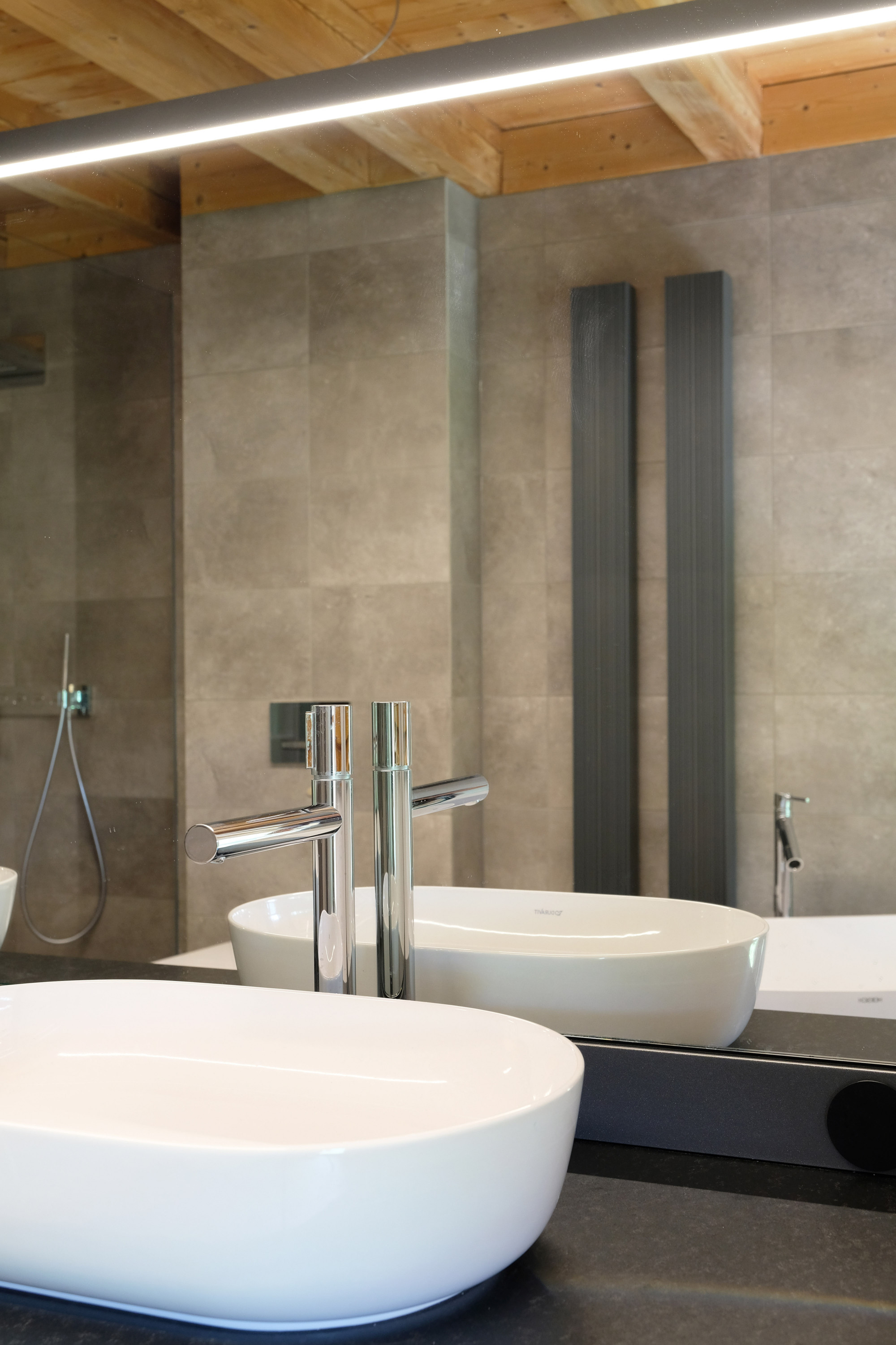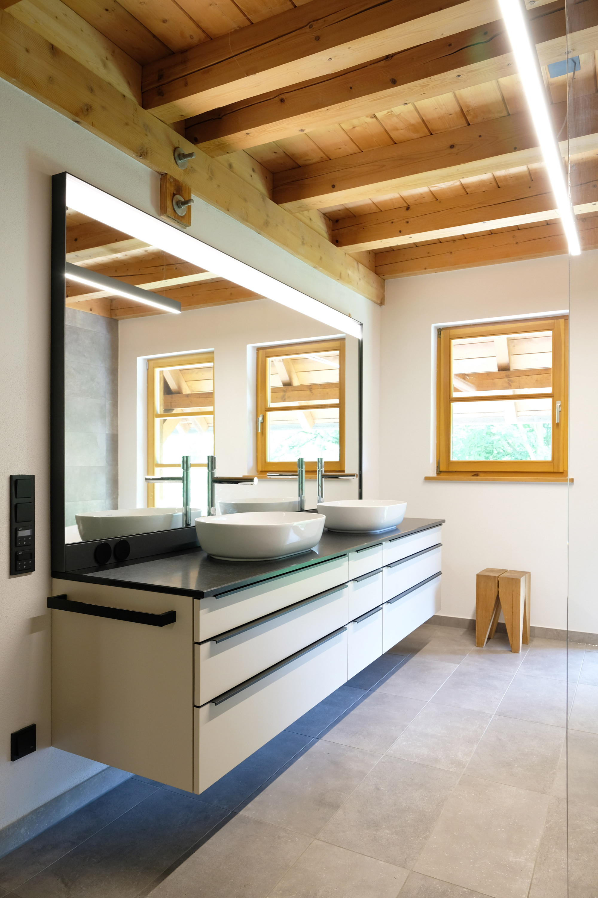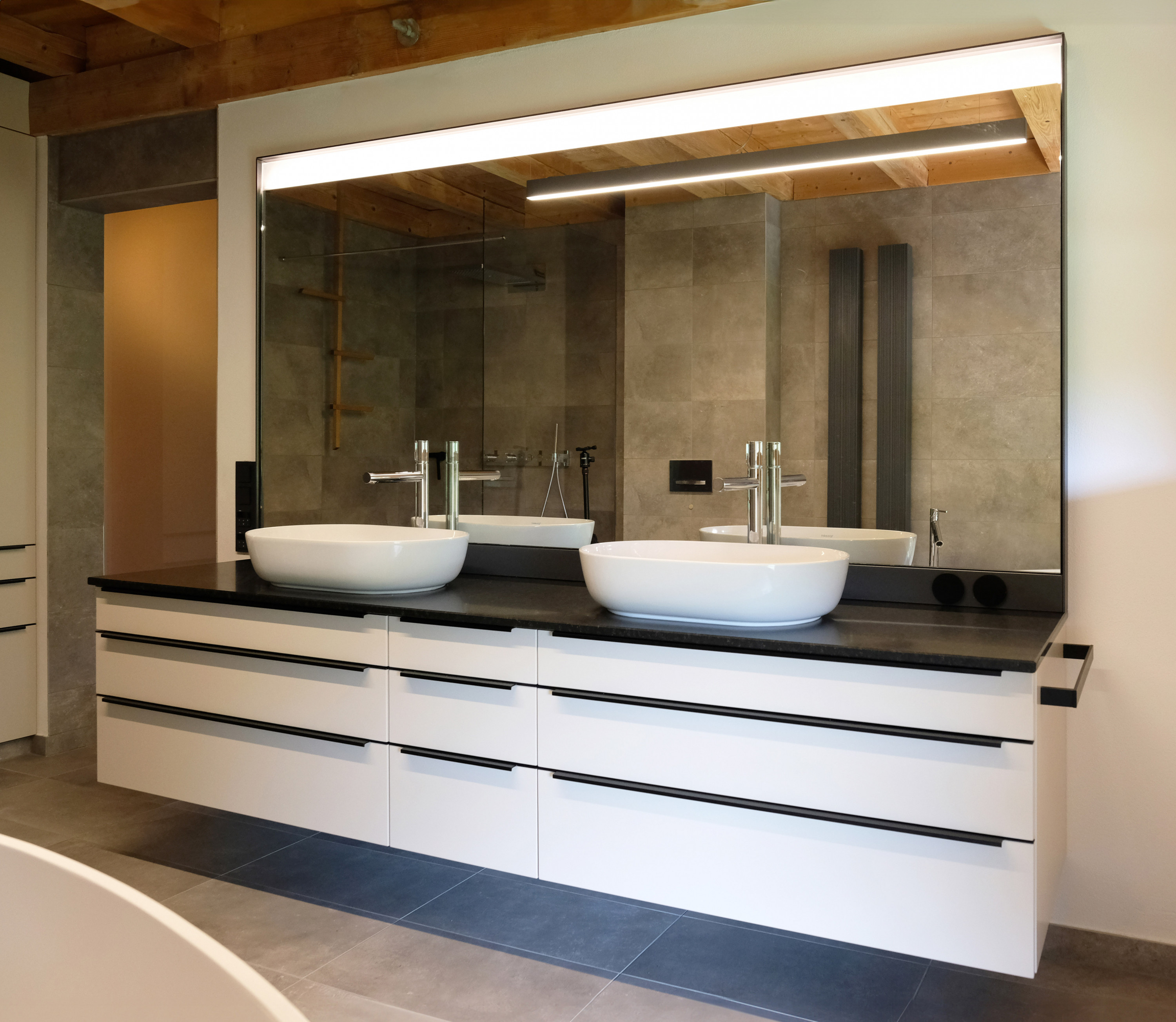 Der Waschtisch ist schwebend an der Wand befestigt, die großzügigen Spiegel darüber sind in präzise gearbeiteten Stahlwinkeln eingefasst wie in einem hochwertigen Bilderrahmen. Hinter dem Spiegel befindet sich eine verdeckt installierte LED-Beleuchtung und in den Stahlwinkel sind die Steckdosen mit integriert.